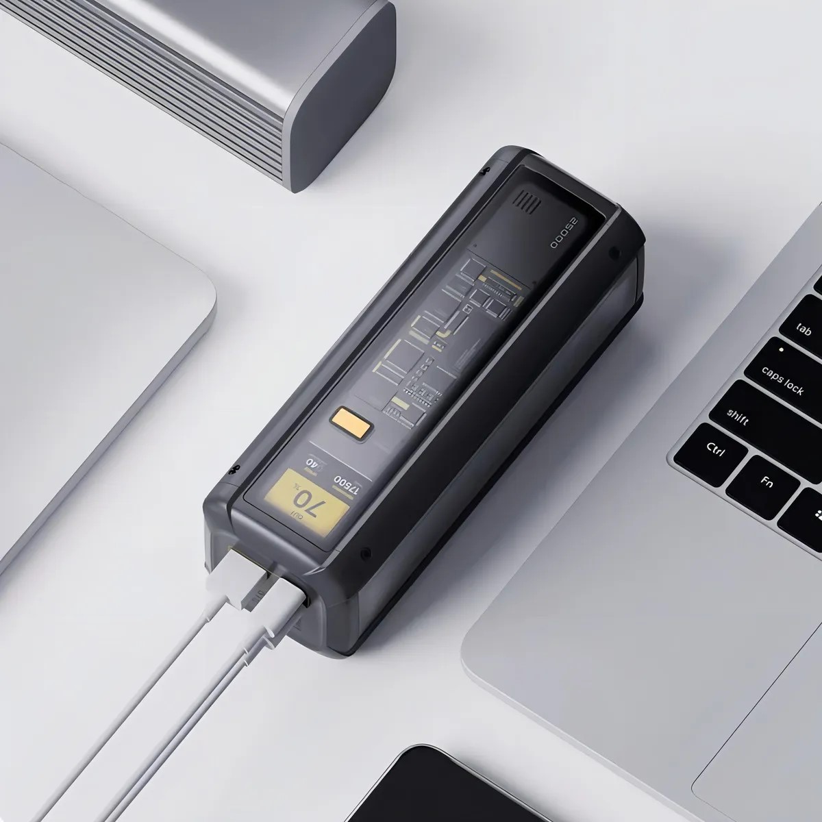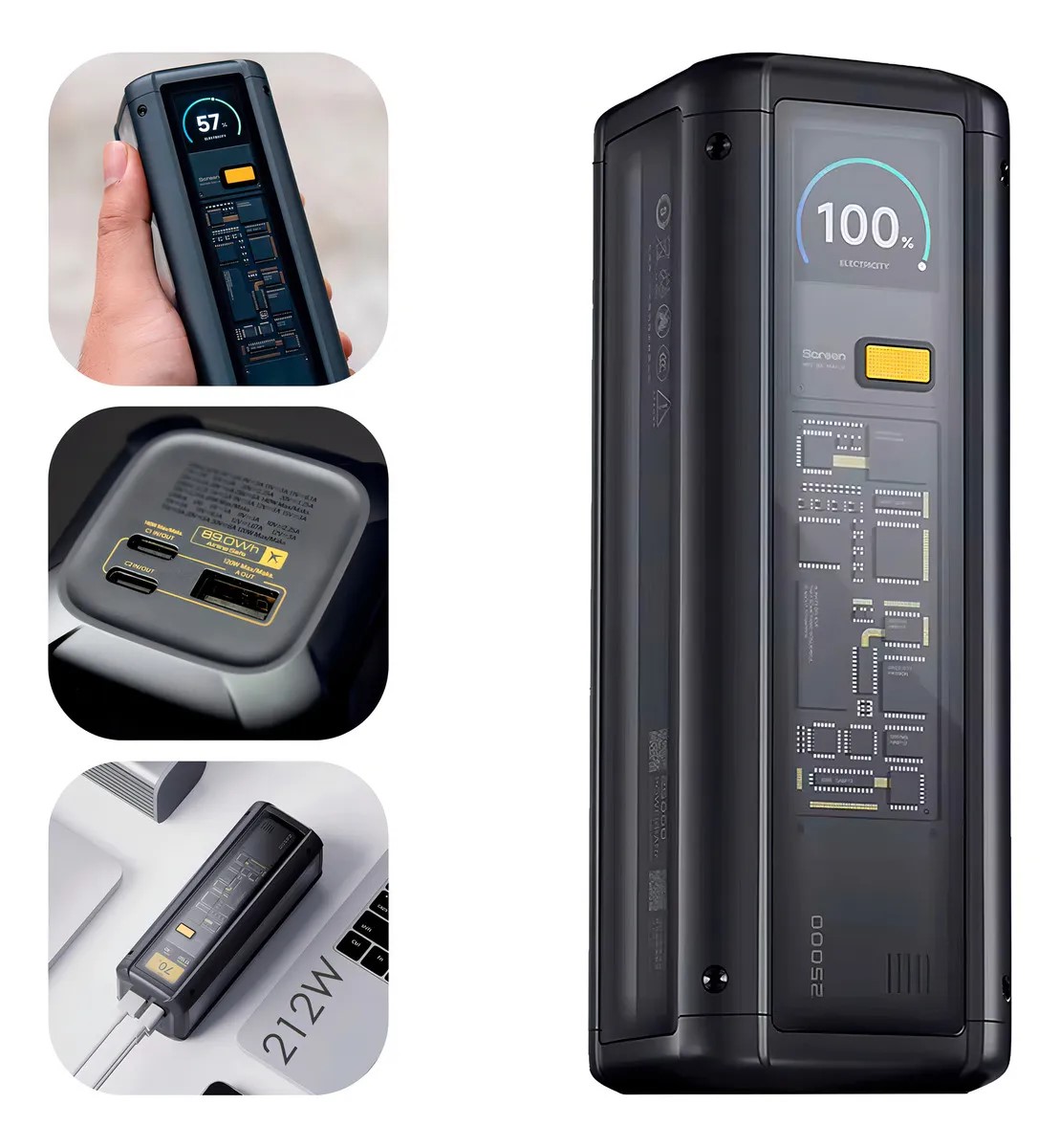 ¡Olvídate de quedarte sin batería para siempre! Este no es un power bank común; es una estación de energía portátil con estética Cyberpunk. Gracias a sus lados transparentes, puedes ver la tecnología en su interior mientras su pantalla a color inteligente te muestra la velocidad de carga en tiempo real. Carga tu laptop, tu móvil y tu tablet al mismo tiempo a velocidades que nunca imaginaste. ¡Es el accesorio definitivo para los amantes de la tecnología!