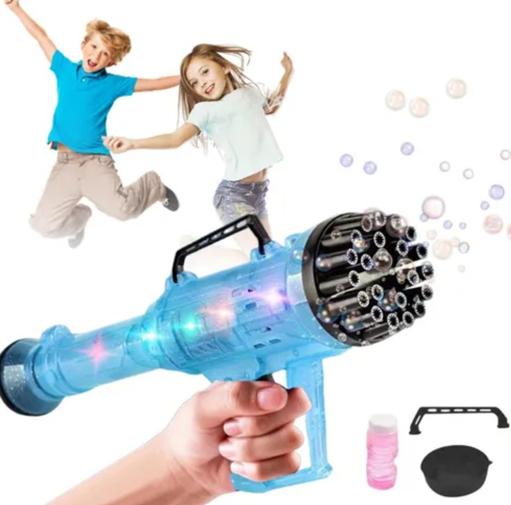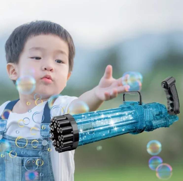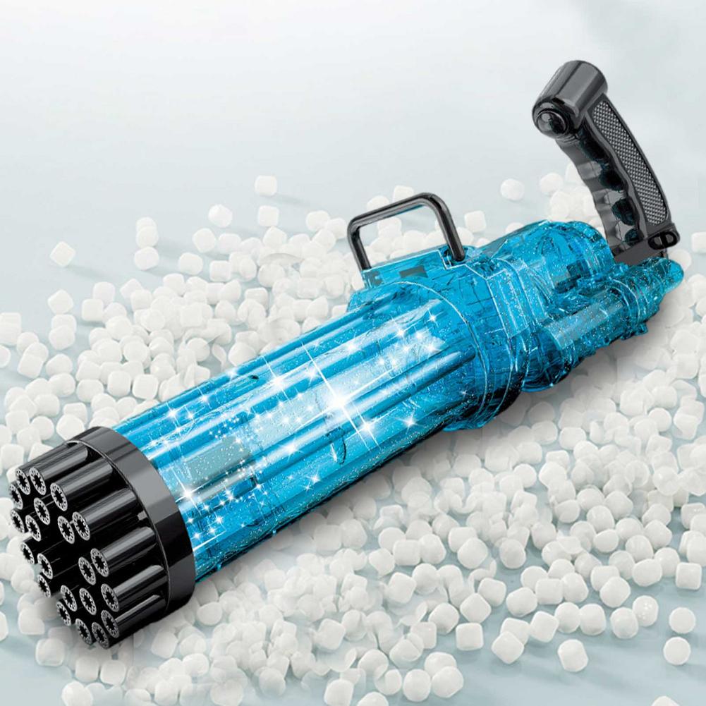 La pistola de burbujas tiene 21 agujeros para soplar cientos de burbujas de colores por minuto